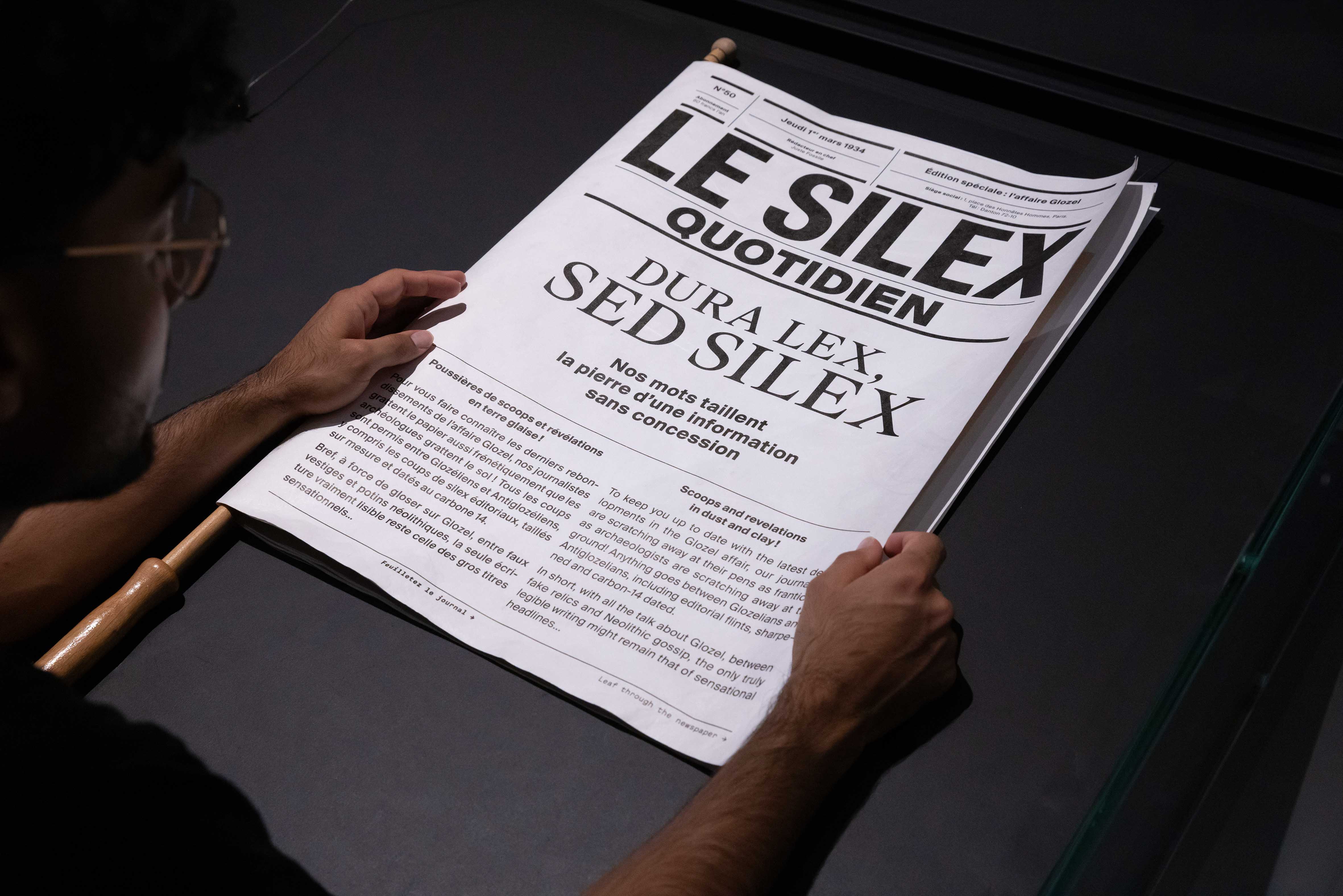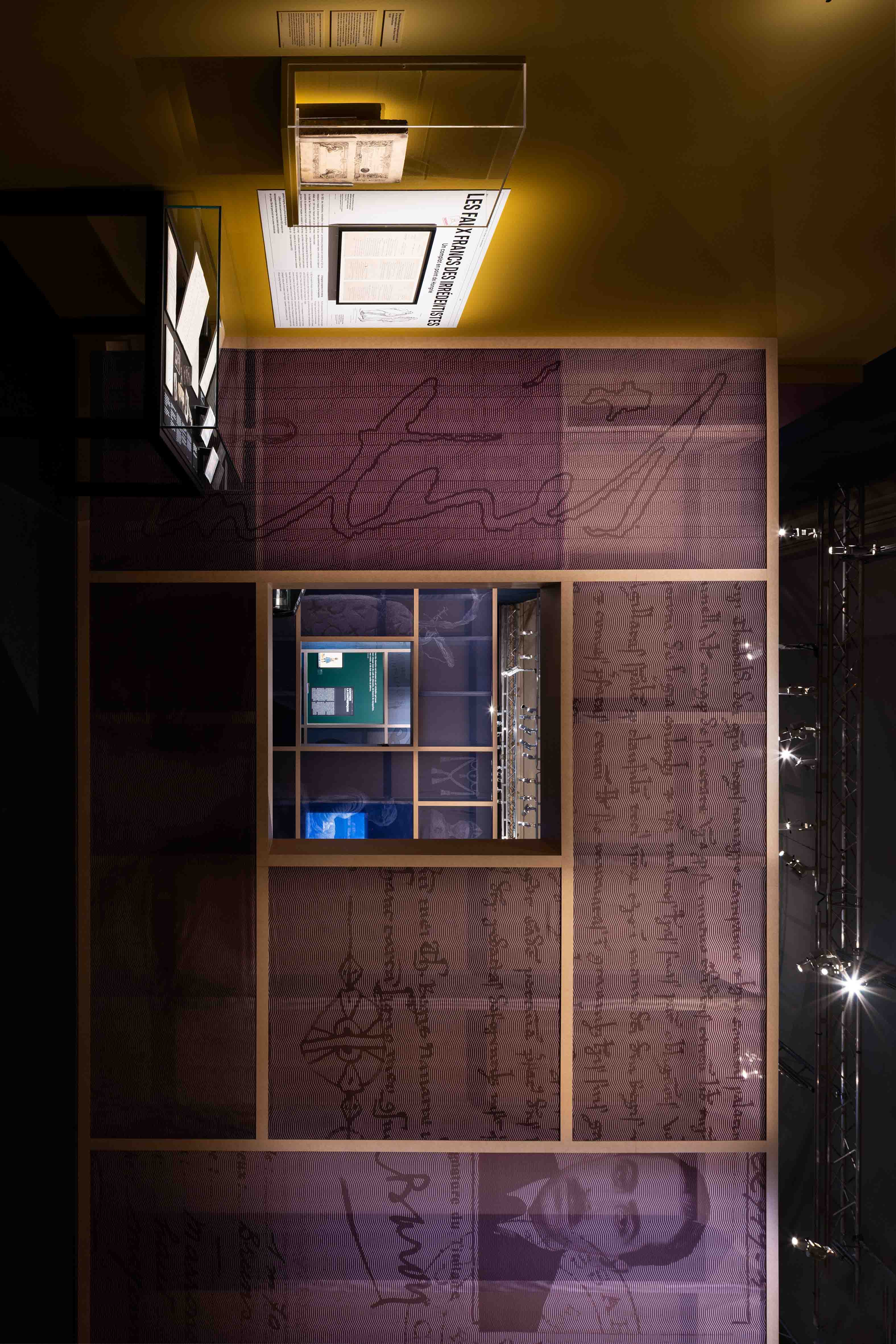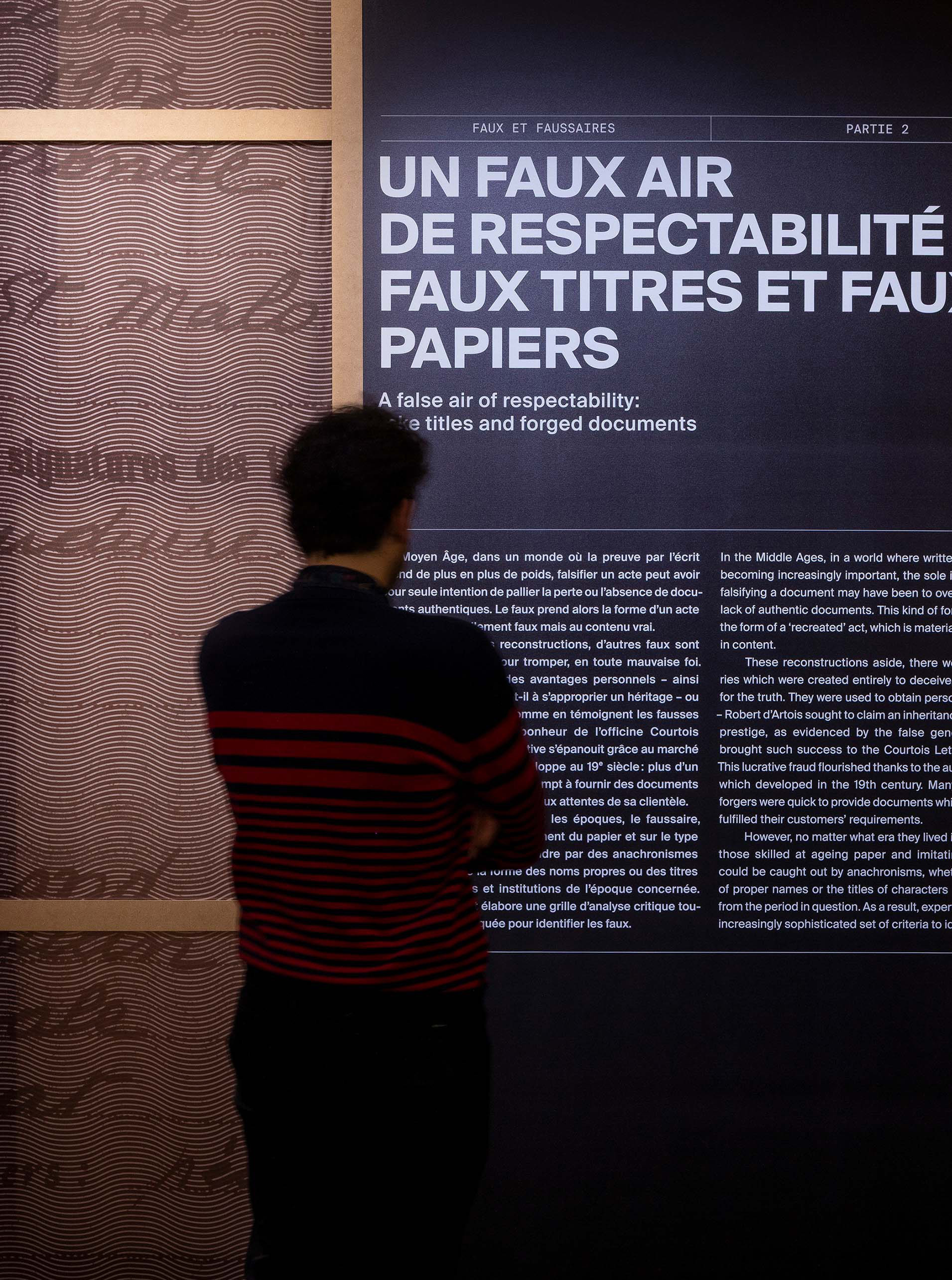 Pensé comme une enquête sur le faux, le graphisme de l’exposition s’inspire des codes du polar et de la presse. Trois figures illustrées— le faussaire, l’expert et le dupé — accompagnent le visiteur à travers les quatre grandes thématiques du parcours. Dans un univers visuel sombre, ponctué de touches colorées, le vrai, le faux et le vraisemblable se mêlent et cohabitent, invitant le visiteur à questionner les apparences et à mener sa propre investigation.