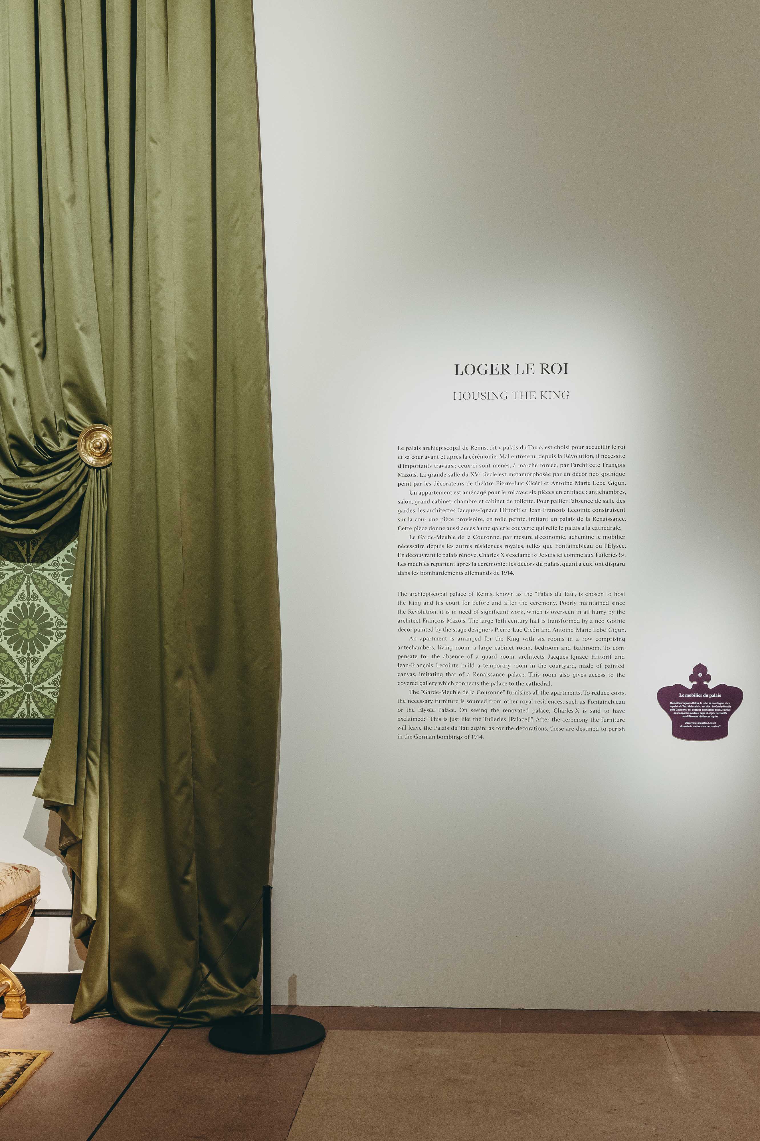 L’exposition “Le Dernier Sacre” au Mobilier national présente les coulisses et préparatifs de la cérémonie du sacre du roi Charles X célébré à Reims le 29 mai 1825. Le Mobilier national raconte cet événement dans le cadre d’une exposition riche en couleur et en décors, sous le commissariat général de Stéphane Bern, assisté pour la scénographie de Jacques Garcia : préparatifs, costumes, carrosse, décors, cérémonie, festin, cadeaux diplomatiques, commandes officielles, produits dérivés d’époque...